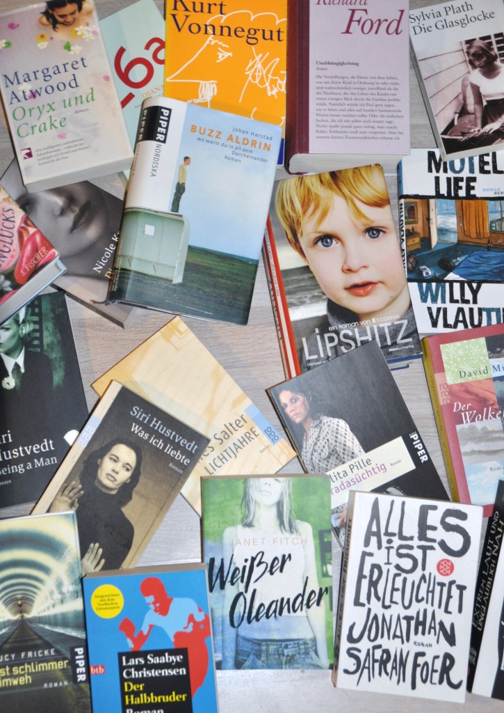 Die Bilder der Buchstapel finde ich sehr schön, “Alles ist erleuchtet”, habe ich vor Jahren gelesen, als ich noch nicht gebloggt habe, da habe ich es aber für den “Thalia”, glaube ich, besprochen und habe es von dem Gutschein bezogen, den ich für eine andere Besprechung bezogen habe und “extrem laut und unglaublich nah”, habe ich vor kurzem auf französisch im Bücherschrank gefunden. Bin aber nicht sicher, ob ich noch so viel französisch kann, um es zu verstehen, ist auch ein bißchen absurd, einen Amerikaner auf Französisch zu lesen, wenn die Muttersprache Deutsch ist.