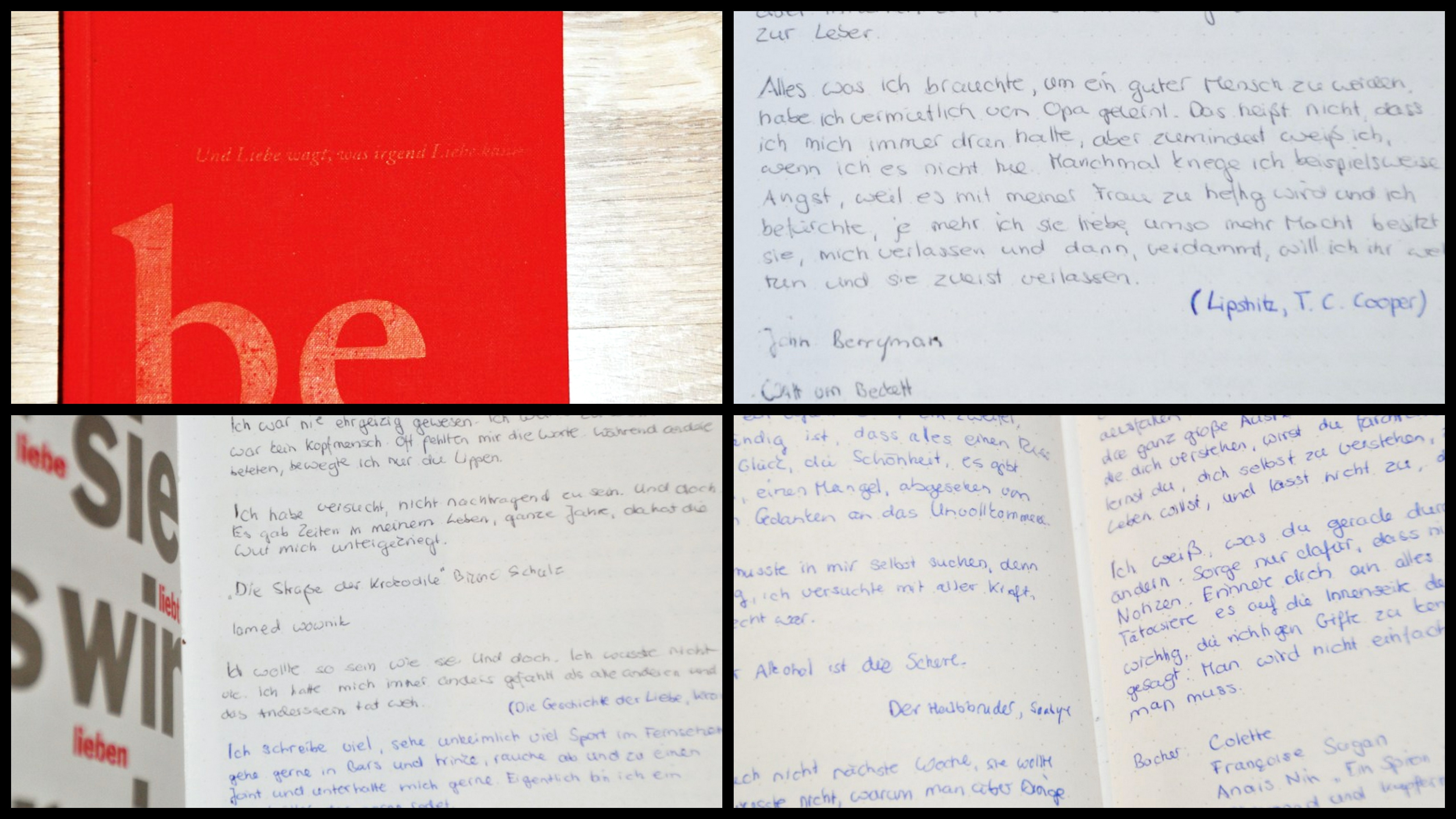 Jahrelang habe ich in einem kleinen roten Notizbuch Zitate aus meinen Lieblingsbüchern gesammelt. Fein säuberlich findet sich in diesem “liebenden Notizbuch” aus der Büchergilde Zitat an Zitat, immer dazu vermerkt, aus welchem Buch dieses stammt. Dieses unscheinbare Büchlein gehört zu den wertvollsten Besitztümern meiner Bibliothek, da es die schönsten und wichtigsten Passagen aus Büchern versammelt, die sich an einen ganz besonderen Platz in meinem Herzen eingenistet haben. Mein ganz persönlicher Kanon aus literarischen Perlen.